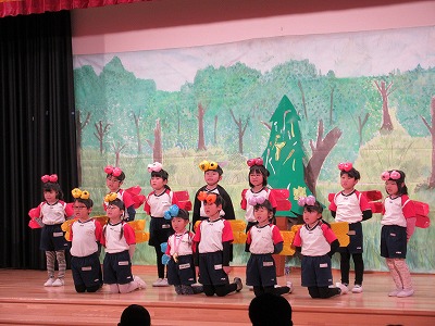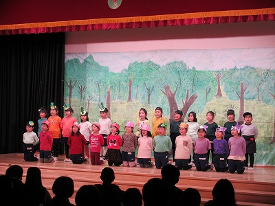 今日は年長組の生活発表会でした。朝から「発表会楽しみ!」な子もいれば、「セリフなんだっけ?」と確認する子もいました。緊張もあったかと思いますが、歌や劇中のダンス等楽しみ、全員合唱でも元気いっぱい歌をうたって、年長組らしい歌声を聞かせてくれたように思います。合奏やハンドベルの演奏では、友だちと音を合わせて取り組む姿がとても頼もしかったです。