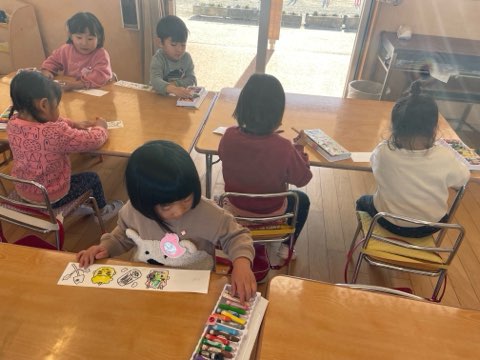 節分についての話をよく聞いて理解を深め、「怒りん坊鬼はピンクにする!」と言いながら色塗りを楽しむ姿がありました。