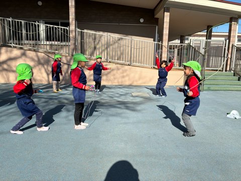 園長先生から縄跳びに挑戦している子を褒めてもらい、外遊びの中で、「縄跳び大会をしたらどうか」と園長先生からアドバイスをいただきました。その後、希望者を募り1分間で前跳びが何回できるかチャレンジしました。2人組になり、片方が跳んで、もう片方は跳んだ回数を数えて分担をしてそれぞれ取り組みました。