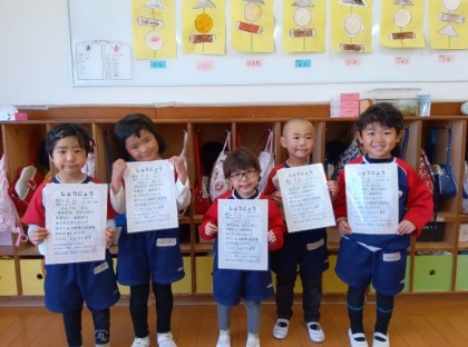 今日は未満児発表会がありました。2部は、にじ組、たんぽぽ組2歳児クラスの発表でした。少し緊張したり恥ずかしそうにしたり、その中でもお家の人に見てもらえて嬉しそうにしたりと、様々な姿を見せてくれた子どもたち。日々の活動の中で練習を重ねてきた歌や手遊び、呼名などもすべてとても上手に表現してくれました☆お家に帰ったら、たくさん褒めてあげてくださいね。