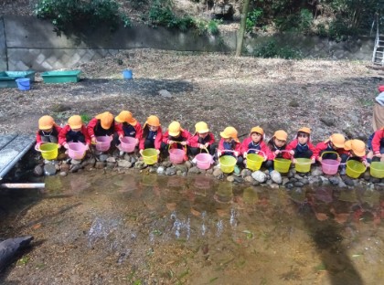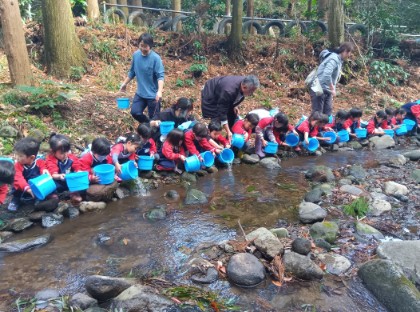 小さなバケツに入っているヤマメを見ると「かわいい」「小さい」など歓声が上がり、放流した時には元気に泳いでいるヤマメを目を輝かせて見ている姿がありました。その後の集会では漁業組合の方の話しを真剣に聞いている姿がありました。今後も川に足を運びヤマメを通して川をきれいにする大切さや、生き物に興味関心が深められるようにして参ります。長靴のご協力ありがとうございました。また、群馬県漁業組合の方々お忙しい中ありがとうございました。 ○ヤマメの放流会進行○