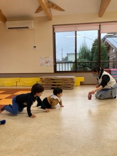 ひげじいさんの手あそびをクリスマスバージョンにしてうたいました。ママのおひざに座って親子でふれあいながらみんな上手にできたので、きっとサンタさんがきてくれるでしょう!