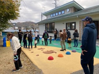 続いて、今年度は園庭あそび。小さな子はシャボン玉をしたり、大きな子はブランコ、鉄棒、タイヤ渡りなど親子でたくさん体を動かしました。