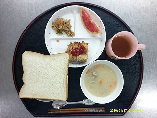 ・食パン・チーズハンバーグ・きんぴら風サラダ・グレープフルーツ