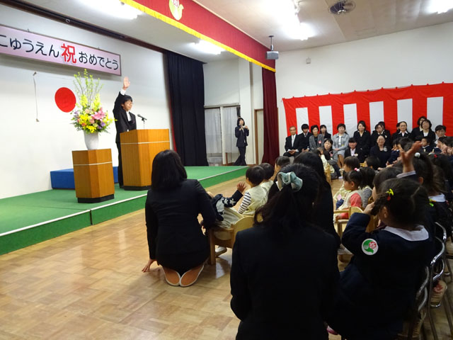 入園したばかりの子もいるから泣きわめいている子も多いかなと思っていましたが、みんなとても落ち着いていて、しっかりとお話を聞く姿が見られました。祝辞の中で「保育園の活動が楽しみな人!」と聞くと、たくさんの子が手を挙げてくれました。協力してくれてありがとう!