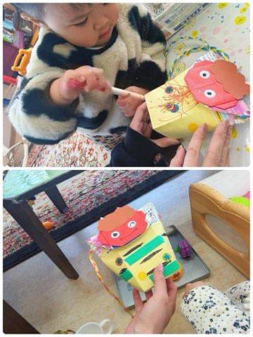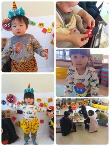 1月28日(水)の赤ちゃんの日は、0才から3才まで幅広い年齢のおともだちが来所してくれました。はらぺこあおむしのペープサートを作ったり、節分に向けて鬼のポシェット作りをしました。鬼のポシェットにママと一緒にペンで絵を描いたり、シールを貼って個性豊かに出来上がりました。