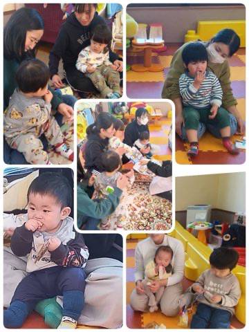 お子さんにはアンパンマンの赤ちゃんせんべい、ママには黒豆せんべい、アスパラビスケットをご用意しました。おともだちやママ同士もお話しながら楽しいおやつの時間が過ごせました。