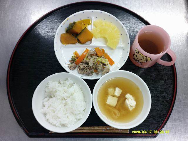 ・ごはん・野菜炒め・かぼちゃの煮物・パイン缶