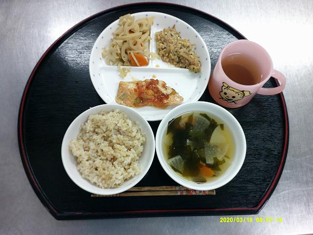 ・ごはん・鮭のピザ風焼き・レンコン金平