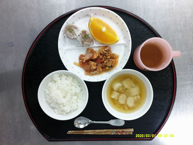・ごはん・鶏肉のトマト煮・ポークシュウマイ・オレンジ