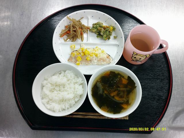 ☆今日は鮭に、コーンとマヨネーズをぬって焼いた「鮭のコーンマヨ焼き」がでました!!甘みが強いたっぷりのコーンと、マヨネーズの塩味がしっかりきいていて、とってもおいしかったです(*^^*)みんなもおいしく食べられたかな?