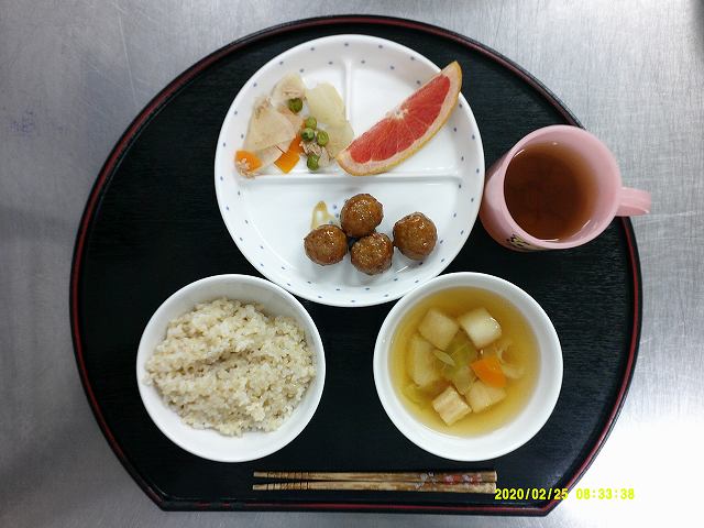 ・ごはん・ミートボール・ツナと大根の煮物・グレープフルーツ