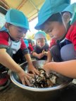 菌ちゃんでは「持ってあげるよ!」と野菜やタオルなど、分担して運んでくれています。以前は手が汚れることを嫌がっていた子も、腕まで入る程ボウルに手を入れて揉み込んでいる姿を見て成長を感じました。最後には「お祈りしたい!」と美味しい冬野菜になるように期待を持っている子どもたちです。