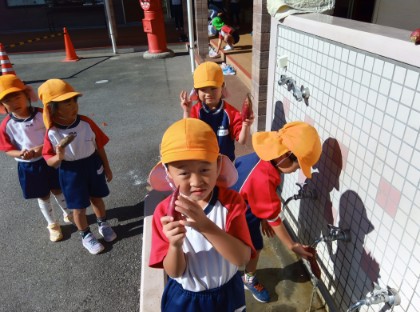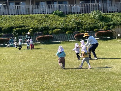 今日は避難訓練でした。タイヤ山で遊んでいる最中でしたが、放送や先生の話を聞き、上手に避難できていました。その後は、ちびっの広場で遊んだり、わんぱく広場で遊んだり、うさぎと触れ合ったりと、広い範囲で遊ぶことができた子どもたち。みかんを収穫してお昼に食べると「すっぱいけど、美味しい」と喜んでいました。今後もたくさん体を動かして遊べるよう関わって参ります。◯たんぽぽ組担任◯