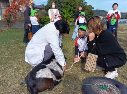 子どもたちが楽しみにしていた動物ふれあい教室が行なわれました。4月から半年間動物当番を続けてきて、日々お世話をし、動物と関わる中でたくさんの気づきがある様子の子どもたち。今年の年長組の誕生絵本は動物に関する絵本を選びましたが、子どもたちに読んでみると真剣に見る様子が伺え、獣医という仕事に興味を示していました。そんな中での動物ふれあい教室だったため、前々から期待を高め、「どんな先生がくるんだろう」「質問何にしようかな」と話す声が聞こえました。動物のプロに色々なことを教えてもらったり、聴診器で心臓の音を聞かせてもらったりと普段なかなかできない貴重な体験をさせていただき、子どもたちにとって動物のことを理解する良い機会となったように思います。今後も命あるものと関わる上で、優しい気持ちで大切に関われるよう後押しして参ります。保護者の皆様も平日にも関わらず、ご参加いただきありがとうございました。★年長組担任★