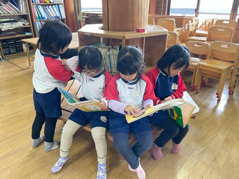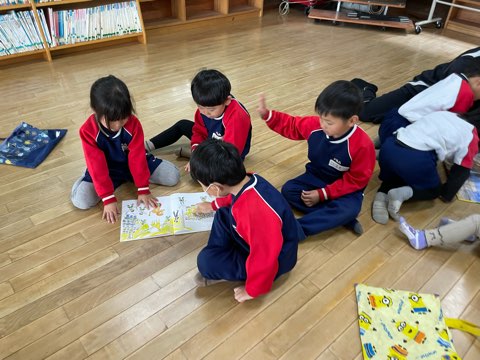 室内に入りこの後の予定を確認しました。今日は午後に図書館に行く予定でしたが、一人の子が「今日は午後から雨が降るらしいよ」と教えてくれました。「雨だと行けないよ」「合羽を着て行く?」「合羽を着ても絵本は濡れちゃうよ」と色々な意見が出ましたが、最終的に午前の活動と入れ替えることになりました。図書館では好きな絵本を先生に読んでもらったり、平仮名が読める子は自分たちで読んで楽しめました。