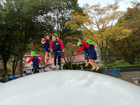 まずはふわふわドームでぴょんぴょん跳ねて友だちと楽しみ、長い滑り台では、お尻が痛くなるまで滑って遊んでいました。シーソーやその他のアスレチック遊具を次々と楽しむ様子がありました。