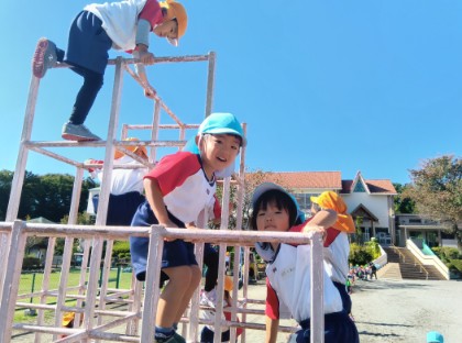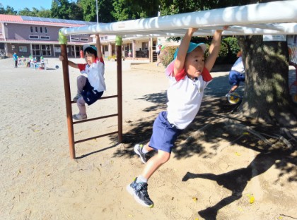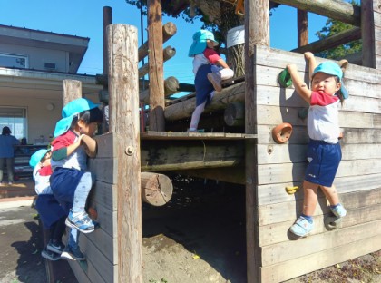 運動会や駅伝大会などの行事も落ち着き、戸外遊びが充実しています。ツリーハウスの壁に挑戦する子、雲梯に取り組む子、ジャングルジムで上を目指して登る子など、子どもたちそれぞれで遊びを展開する姿が伺えています。最近では、自分たちで話し合い、仲間を集めて、鬼ごっこを始められるようになり成長を感じています。