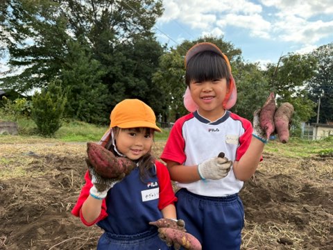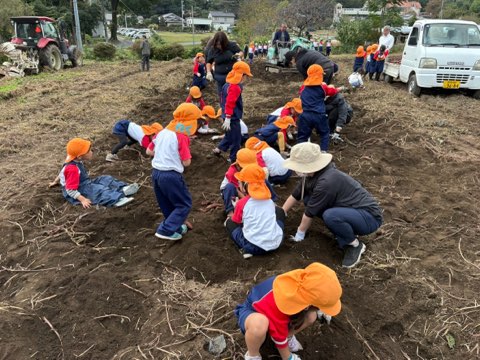 登園時からさつまいも掘りを楽しみにしている姿が見られ、「大きいお芋あるかな?」「いっぱい見つけよう!」とお友達同士でも話していました。園長先生のお話を聞いて丁寧に折れないよう土を掘っている姿が見られました。「出てきた!」と宝探しのように楽しんでたくさん笑顔が見られました。土が固く園長先生が掘ってくれるとみんなでさつまいもを見つけていました。近所の農家さんにも手伝って頂き、トラクターで土を耕してもらうと「すごいかっこいい!」とトラクターに夢中になって見ていました。本日年中組は収穫したさつまいもが持ち帰りになっているのでぜひお家で試食してみて下さい!