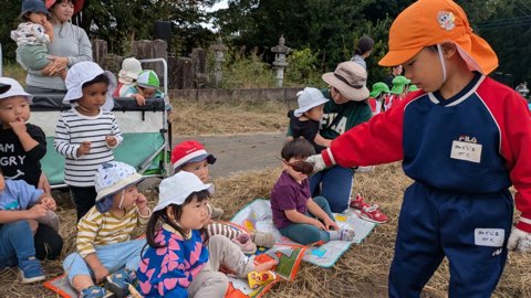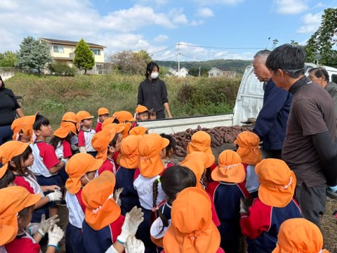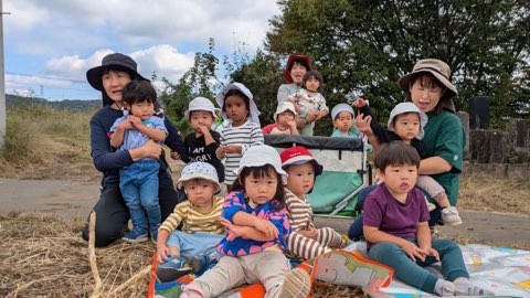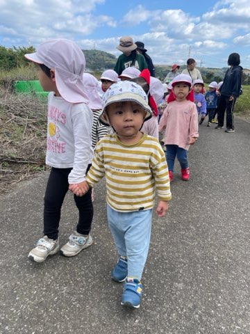 今日は年中さんのさつま芋掘り見学に行きました。お友だちが見せてくれた芋を気に入った様で、手から離さず持っていたい!とお腹に抱える姿が可愛いらしかったです。その後は2歳のお友だちとゆっくり散策しながら帰って来ました。今後も異年齢児との関わりも楽しめるように活動して参ります。