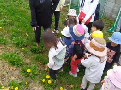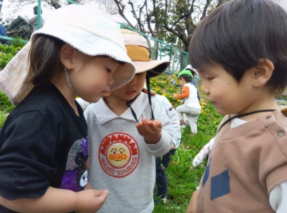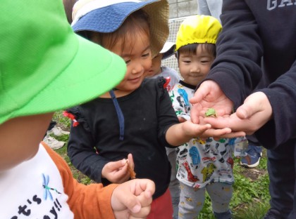 今日からにじ組さんになり嬉しそうな子どもたち。お散歩に行くとお友だちと手をつないで歩いたり、電車ごっこしたりしてたくさん歩くことができました。「タンポポあったよ!」「ホトケノザだ!」と草花の名前を少しずつ覚え、発見を楽しむ姿もありました。カエルを見つけると「カエルだ!」「見せて見せて!」「触りたい!」と触れ合いを楽しんでいました。これからも様々な自然と触れ合い、楽しめるよう関わって参ります。◯にじ組担任◯