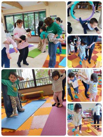 休憩をはさんで、今度はサーキット。丸いフープをくぐったり、スティックを置いてジャンプ(またぐ) 平均台も繰り返し行うことで、ちょっとドキドキしていたお友だちも楽しさがわかって笑顔がたくさん見られました。