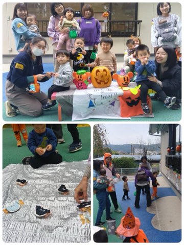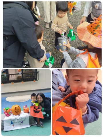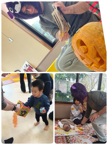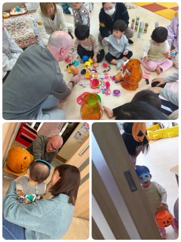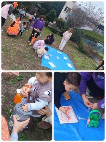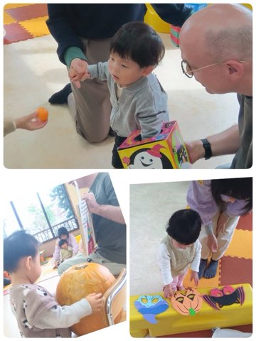 ウォレン先生の続きで、第二部も普段みんなが遊んでいるミルク缶の中に手を入れて、取り出した色のポンポンペンを使って、お化けをポンポンと色塗りしました。ラムネのおみやげもハロウィンバッグに入れて、ゴムチップのお庭から、動物が放牧されている第三駐車場までお散歩しながらのゲームでしたよ。あんよが上手になってきたお友だちもいました。