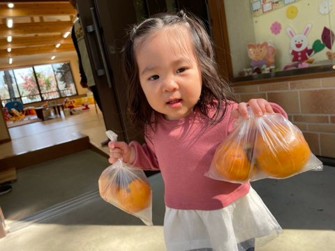 10月のある日、幼稚園のバスの先生が園庭の柿をとってくださり、かわいいお友だちが「柿やさん」をしてくれました。