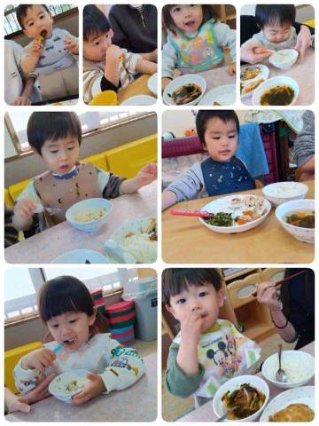 「いただきます」のご挨拶をすると待ってましたと勢いよく食べ始め、おいしそうなお顔がたくさん見られました。「おかわりください」とすまし汁を何回もおかわりをしてくれて、いっぱい食べてくれるお友だちもいました。