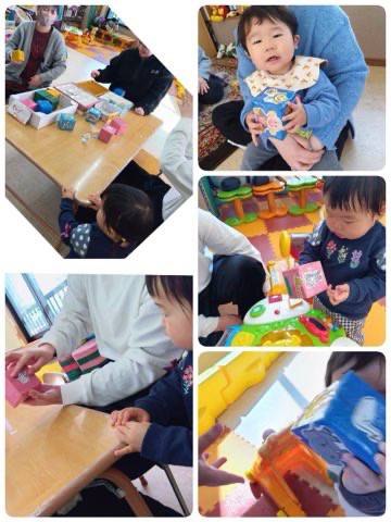 11時15分に皆でお片付けをし、ひげじいさんの手あそびをするとママのお膝の上でおともだちも上手に手あそびができました。その後、「びっくりばこ」の絵本を読み聞かせすると、近くにきて真剣に聞いてくれるお友だちもいました。