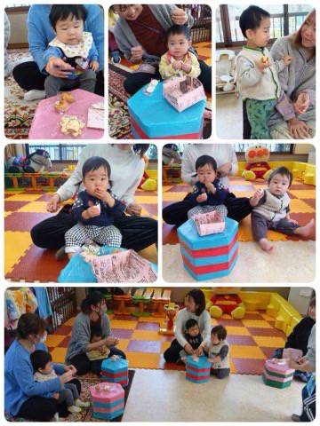 11時15分頃お片付けの声かけをすると、皆上手にかごにおもちゃを入れる姿に、成長を感じました。今回は、「こぶたぬきつねこ」のペープサートを演じてみました。みんなママのお膝でどこから動物が出てくるのか目をキョロキョロさせ楽しんでみてくれましたよ。そして、紙芝居「ながーいながーい」や大型絵本「おしくらまんじゅう」は絵本の近くまで来てくれたり、先生のお手伝いをしながらみてくれたお友だちもいました。