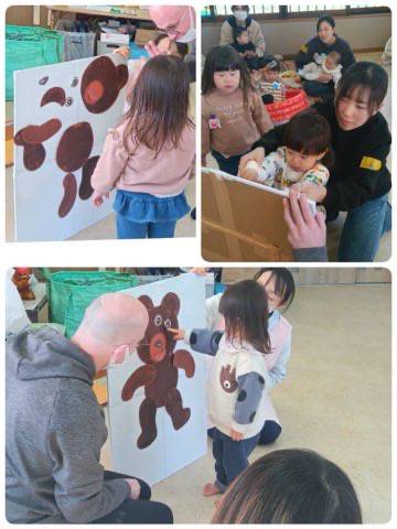 ウォレン先生が持ってきてくれたおもちゃにみんな興味津々でした。ブロックやおままごとなど、真剣に遊んでいました。なかでも盛り上がったのはテディベアをパネルにくっつける遊びです。「eyes」「mouth」など体のパーツを英語で教えてもらい、それぞれのパーツを貼り付けていきます。ママとも相談しながら完成!!完成したテディベアを見つめ、嬉しそうなお友だちのお顔がとても印象的でした。