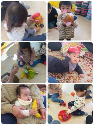11時20分。皆で集まり「まぁるくなーれ」の集団遊びをしてみました。ママ達もお友だちの可愛らしい姿を優しく見守ってくれました。ママのお膝に座って、「うまはとしとし」のわらべうたも楽しみました。