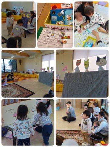 11時15分頃お片付けの声かけをすると、皆上手にかごにおもちゃを入れる姿に、成長を感じました。今回は、「こぶたぬきつねこ」のペープサートを演じてみました。みんなママのお膝でどこから動物が出てくるのか目をキョロキョロさせ楽しんでみてくれましたよ。そして、紙芝居「ながーいながーい」や大型絵本「おしくらまんじゅう」は絵本の近くまで来てくれたり、先生のお手伝いをしながらみてくれたお友だちもいました。