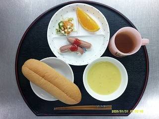 ・コッペパン・ウインナー・チーズサラダ・オレンジ