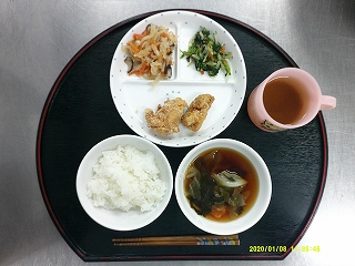 ・ごはん・鶏肉のから揚げ・切干大根の煮物・青菜の磯和え