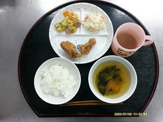 ・ごはん・鶏肉のから揚げ・キャベツのソテー・ポテトサラダ
