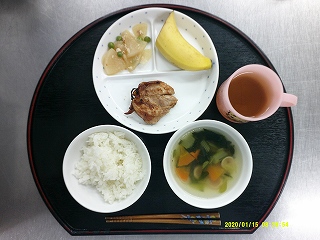 ・ごはん・豚肉の生姜焼き・さつま芋ツナサラダ・桃缶