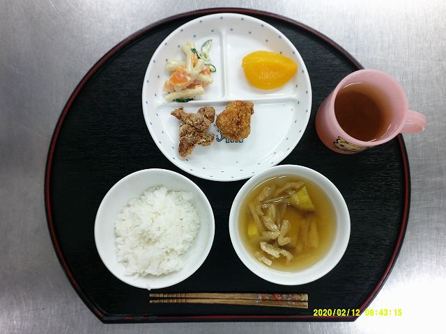 ・ごはん・鶏肉のから揚げ・マカロニサラダ・桃缶
