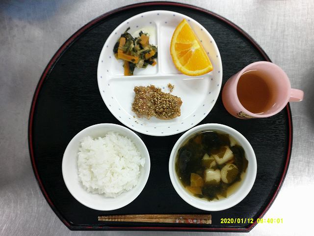 ・ごはん・鶏肉のごま焼き・ほうれん草の煮びたし・オレンジ