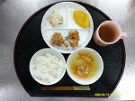 ・ごはん・鶏のから揚げ・ポテトサラダ・桃缶・コンソメスープ