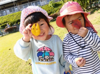 広い芝生の上で元気いっぱい走り出すお友だち。「よーいどんしよ!」と誘ってくれる子もおり,たくさん体を動かしながら楽しんでいます。葉っぱを拾って先生が穴をあけると,「おばけだじょー」とおばけごっこを楽しんでいました。落ち葉拾いもしてくれました。散策では大間々保育園のお友だちと会うことができ、手を振って嬉しそうでした。今後も戸外活動が充実できるよう関わって参ります。〇ひかり組担任〇