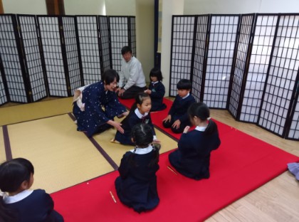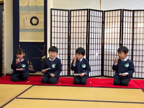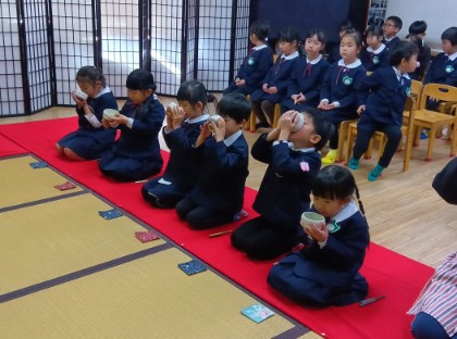 は今日は、新しい年を迎えて初めてのお茶会(初釜茶会)がありました。今回のお干菓子は紅白のお菓子で、「縁起の良い、めでたい」という意味も知り、嬉しそうに味わうことができていました。また、お茶が入ったお茶碗を帛紗という布に載せてお運びをしました。お茶碗を持ったまま座り、お客さんのお友だちに出すという動作を子どもなりに一生懸命取り組んでいました。