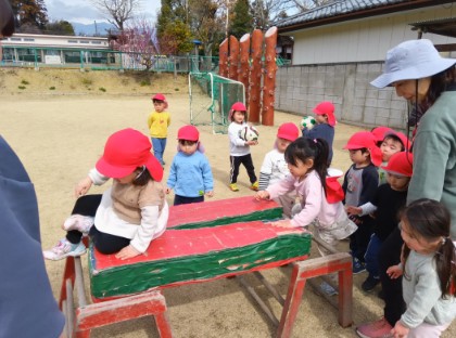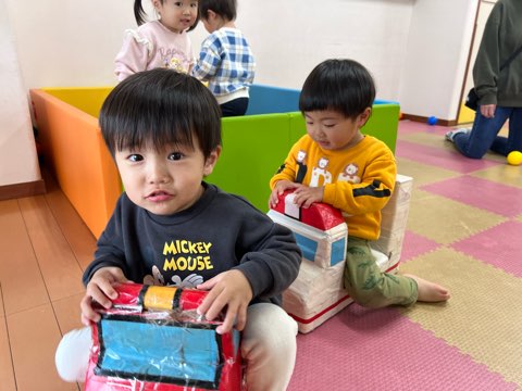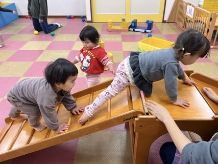 久しぶりの雨で「あめだー!」と喜んで登園する子もいました。お部屋では,滑り台の戸板を上手に登り,「シュー!」と何度も滑って楽しんでいました。車の玩具に乗って「うみいく!」「ベイシアいく!」とおでかけ気分も楽しんでいました。園内散策では玄関ホールのひな人形を見に行き,目を輝かせながら見ていました。今後も雨の日も楽しく過ごせるよう関わって参ります。○ひかり組担任○