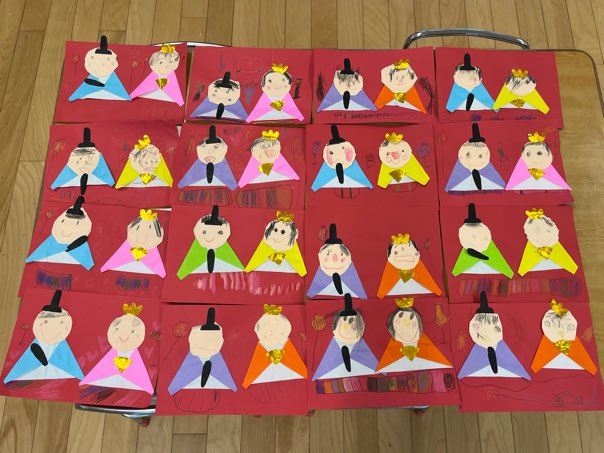 ひなまつり制作の壁面の仕上げをしました。顔やぼんぼり、台などを色鉛筆で描きました。「こんな感じにしたよ!」「ぼんぼりに光がついてるようにした!」と友達同士で発表することで、互いに刺激を受けて「もっと描きたいから待ってて!」と長時間集中して取り組む姿がありました。