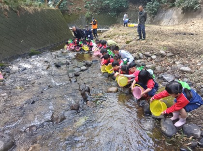 小さなバケツに入っているヤマメを見ると「かわいい」「小さい」など歓声が上がり、放流した時には元気に泳いでいるヤマメを目を輝かせて見ている姿がありました。その後の集会では漁業組合の方の話しを真剣に聞いている姿がありました。今後も川に足を運びヤマメを通して川をきれいにする大切さや、生き物に興味関心が深められるようにして参ります。長靴のご協力ありがとうございました。また、群馬県漁業組合の方々お忙しい中ありがとうございました。 ○ヤマメの放流会進行○