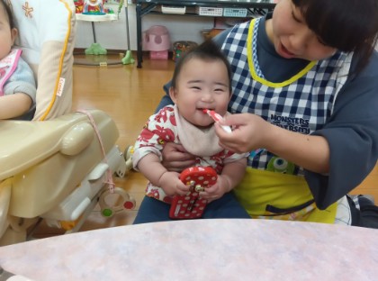 今日はテラスで遊びました。先生と一緒にゆったり過ごしながら、お友だち同士で触れ合ったり、声を出したりと楽しそうにしていました。テラスの前をお兄さんお姉さんが通るたびにニコッとしたり手を振ったり、とても可愛いかったすばる組さん。たくさん声を出しながら過ごし、離乳食も自分のペースでパクっと食べられました。