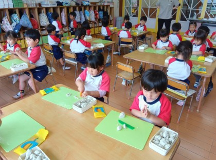 年長組でみそ作りを行いました。2日前から園長先生が仕込みに行ってくださり、今日は二人の先生に教えてもらいながら、みそだねを樽に投げ込む作業を行いました。一人ひとりの手についている菌が混ざると美味しくなるんだよ!と教えてもらい、張り切って味噌玉を捏ねて、力強く投げ込むことを楽しみました。