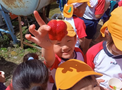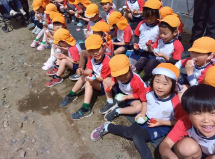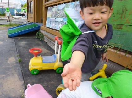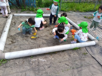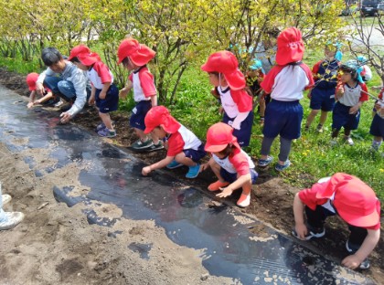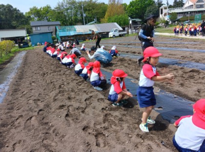 今日は年少組でとうもろこしの種蒔きをしました。お部屋で種を見せると「赤だ!」と赤い種にびっくりしていた子どもたち。畑ではよく話を聞いて、指で穴を空けて植えていました。「土のお布団を優しくかけてね」と話すとそっと土をかける様子も見られ、「こっちもやる?」と楽しんでたくさん植えていました。給食にコーンスープが出ると、「トウモロコシだ!」と喜んで飲んでいる姿が見られました。今後も畑に足を運び、生長を楽しく観察できるよう関わって参ります。