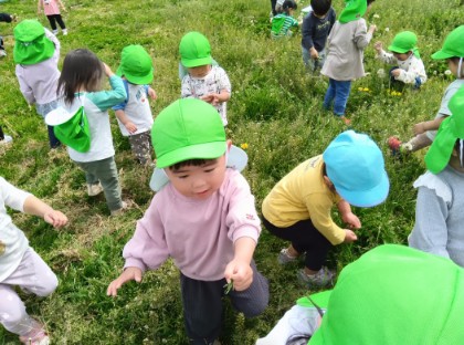 今日は、今年度初、ちびっこ広場で遊びました。シロツメクサやタンポポが咲いている中、好きな遊びを見つけ楽しむ姿が見られました。草丈が長くても懸命に豆自動車を走らせようと奮闘したり、消防車の荷す台に上がって辺りを見たりとゆったりと過ごす事が出来ました。